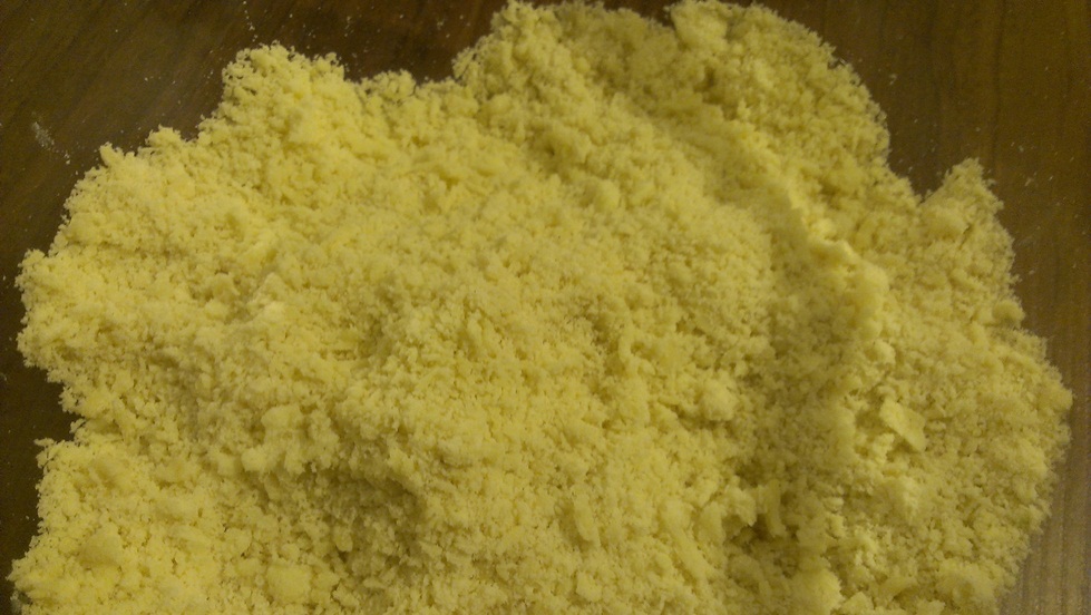 Tamizamos la harina con ayuda de un colador y la ponemos en un bol, añadiéndole la pizca de sal. Cortamos la mantequilla fría en cubitos y lo añadimos a la harina. Ahora tenemos que integrar la mantequilla con la harina, lo haremos pegando pellizquitos a ambos ingredientes de manera que la mantequilla no se caliente y nos quede una especie de arenilla o serrín, como os muestro en esta foto.