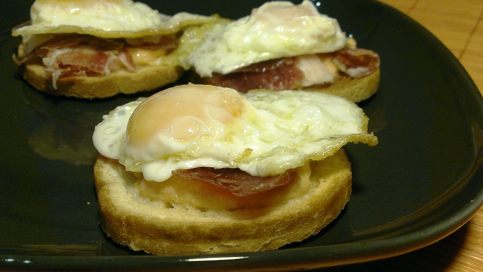Fuera de bromas, esa es mi recomendación, al igual que os recomiendo lo que me dijo mi amigo Campillo (ahora sí), que es buena idea salpicar ligeramente los huevos con el mismo aceite de la sartén con ayuda de una cucharita o de la propia rasera. Cuando estén en su punto (como los de la foto), los sacamos con cuidado con una rasera plana, dejamos que escurra un poco el aceite y los colocamos directamente sobre el canapé, añadiéndole una pizca de sal sobre la yema para terminar. Repetimos la operación con los otros dos huevos que nos faltan, emplatamos y ¡devoramos antes de que se enfríen!