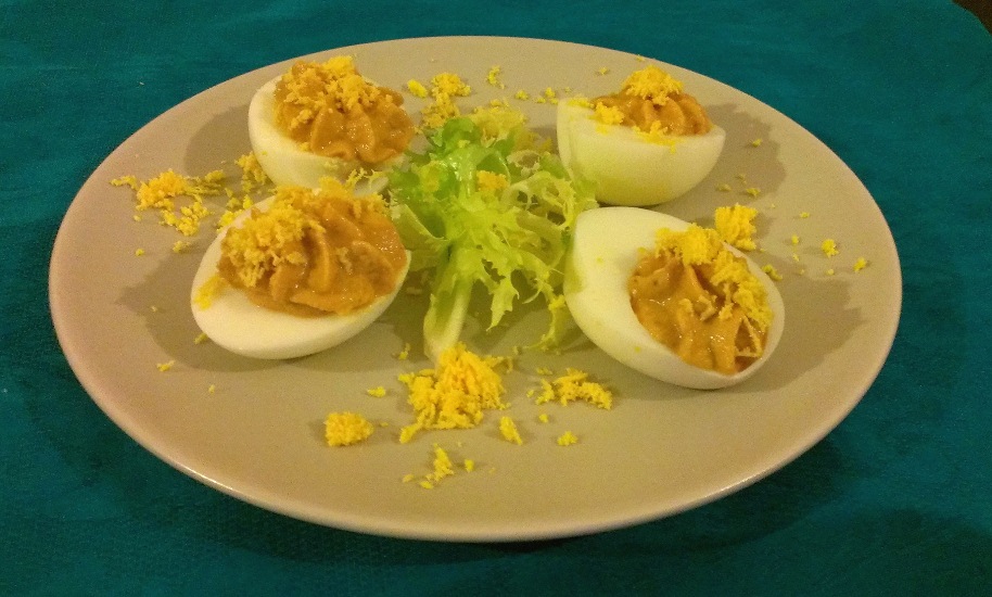 Nota: Para decorar, si queremos «darnos un homenaje» y hemos reservado parte de la yema del huevo cocida; pondremos la yema en el interior de un colador y la presionaremos de manera que, por debajo del colador, nos vaya saliendo un “polvo” de yema con el que espolvorear por encima los huevos.